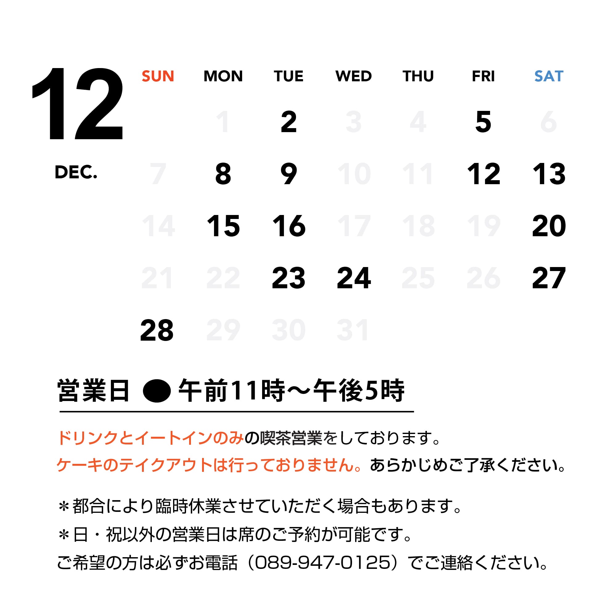 2025年12月の営業日は黒で表記してある日にちになります。 *都合により臨時休業させていただく場合もあります。 *日・祝以外の営業日は席のご予約が可能です。 ご希望の方は必ずお電話(089-947-0125)でご連絡く…
